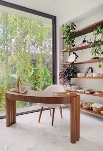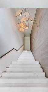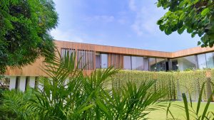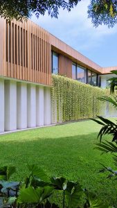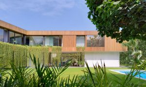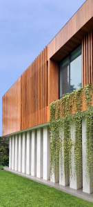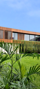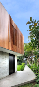 El volumen del primer piso ha sido acabado en mármol travertino de cantera local ranurado, mientras que el segundo ha sido enchapado en madera natural de manera envolvente en todo el volumen, con un juego de texturas y llenos y vacíos que le dan riqueza a la percepción.