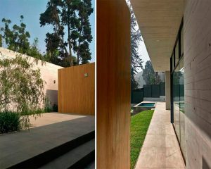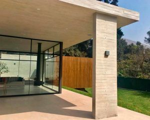 La materialidad de la casa es clara: concreto expuesto, madera y metal, buscando un equilibrio de los materiales en su estado natural y en armonía con la naturaleza circundante.